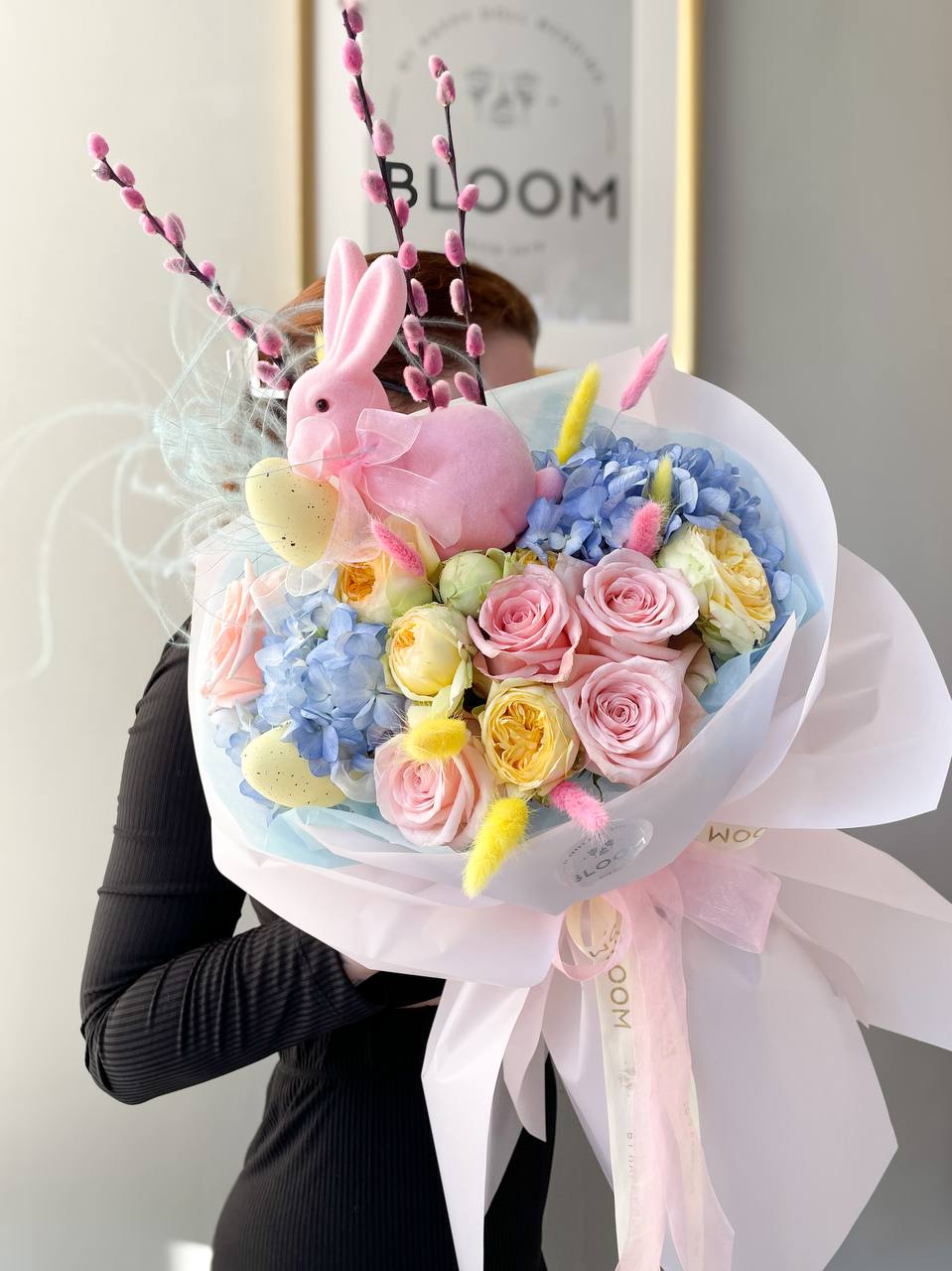 Цей букет — справжня святкова казка, яка поєднує ніжність квітів і теплу атмосферу Великодня. Пастельні відтінки троянд, гортензії та ранункулюсів гармонійно доповнені декоративними елементами — милим зайчиком, вербою та святковими акцентами.