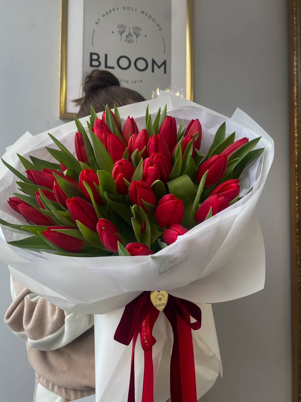 Фірмова упаковка Bloom та витончена стрічка підкреслюють стиль композиції, роблячи букет по-справжньому особливим подарунком.