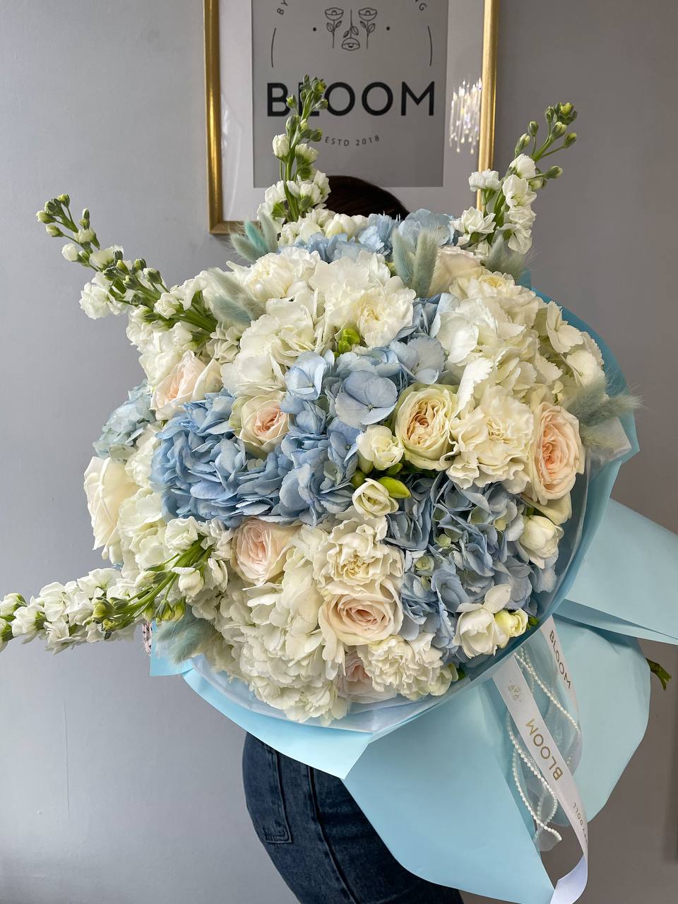 Вишуканий букет у ніжній блакитно-білій гамі, який передає відчуття гармонії та внутрішнього спокою. Повітряна гортензія у поєднанні білого та блакитного кольорів створює об’єм і легкість, троянда O’Hara додає витонченості, а біла фрезія наповнює композицію делікатним ароматом. Біла гвоздика додає м’якості, а лагурус створює трендовий акцент і текстуру. Цей букет виглядає дуже сучасно, ніжно та елегантно — ідеальний подарунок для особливих моментів, коли хочеться подарувати відчуття тепла, турботи та спокою.