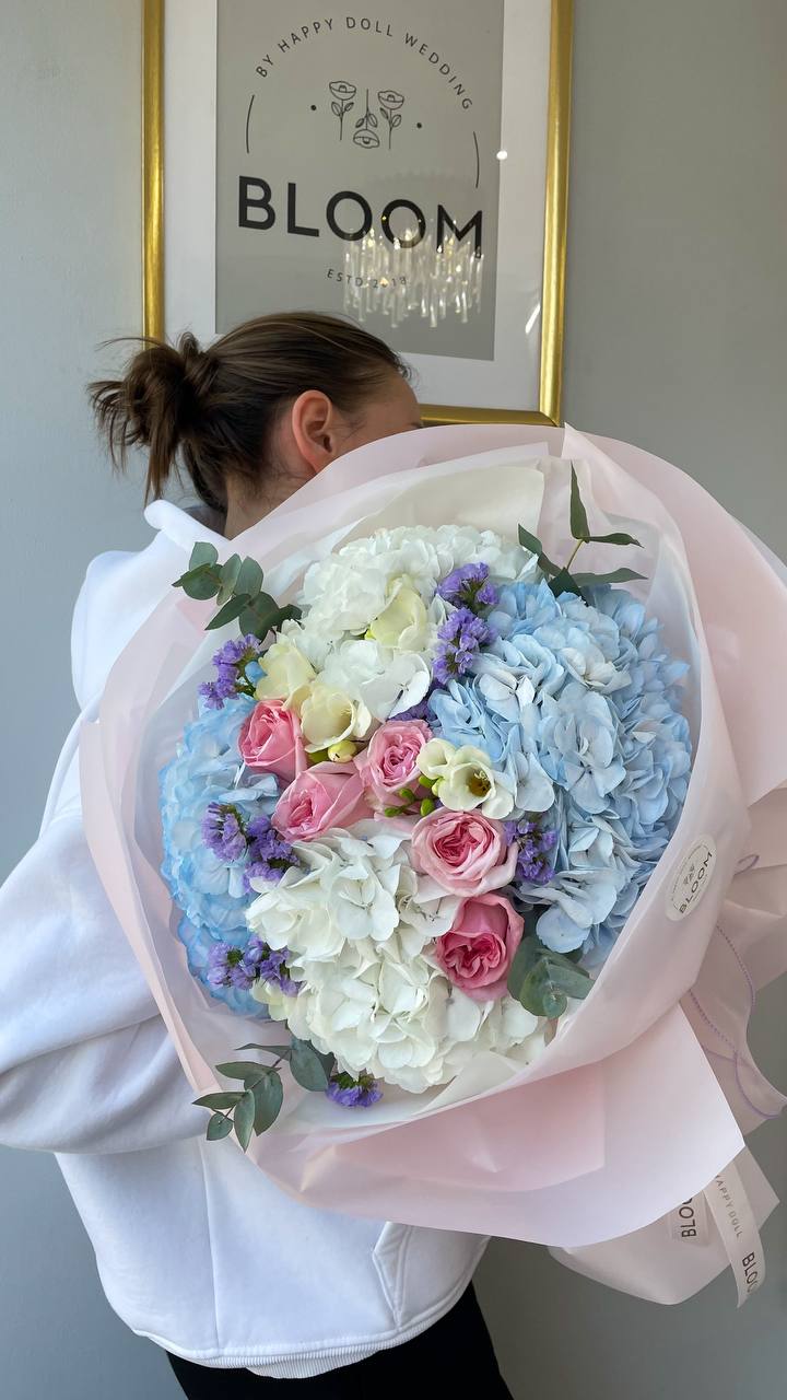 Цей букет — справжня історія про ніжність і витонченість. Великі шапки блакитної та білої гортензії створюють об’ємну, повітряну основу, яка одразу привертає увагу своєю легкістю та благородством.