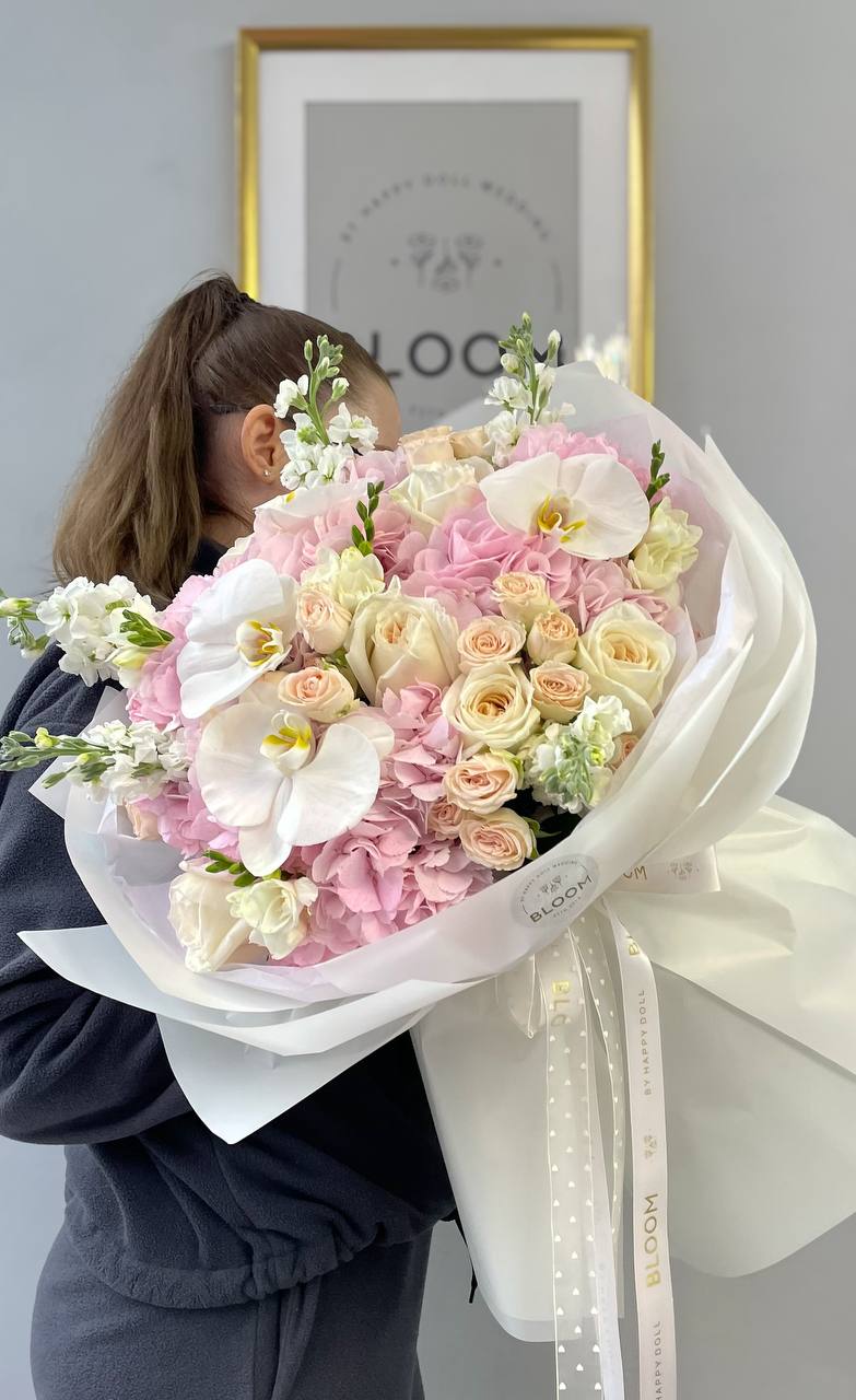 Вишукані орхідеї, делікатні кущові троянди та ніжні ранункулюси гармонійно поєднуються між собою, створюючи розкішну квіткову композицію з легким романтичним настроєм. Світлі кремові та рожеві відтінки роблять букет дуже елегантним і водночас ніжним.