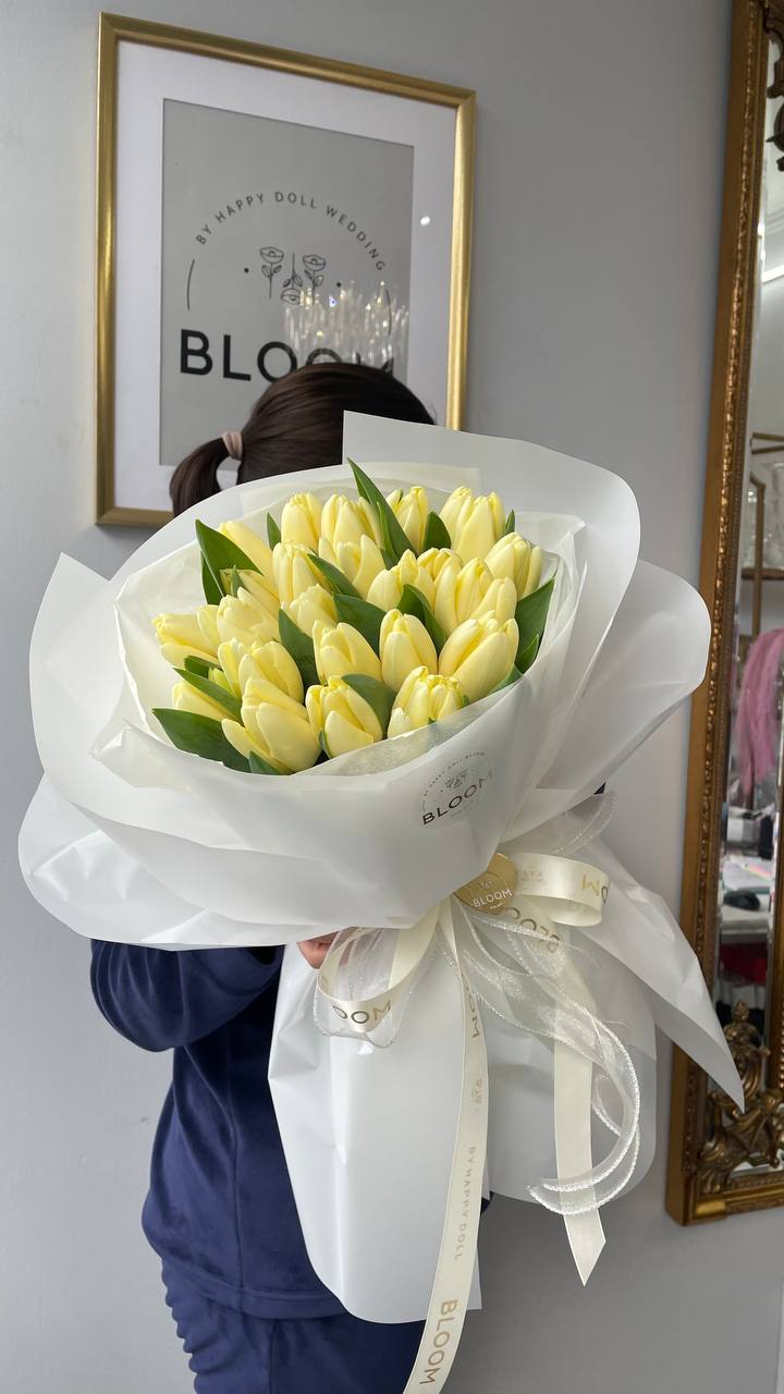 Жовті тюльпани виглядають особливо елегантно у фірмовому оформленні Bloom. Лаконічна біла упаковка підкреслює свіжість квітів та робить композицію сучасною й витонченою.