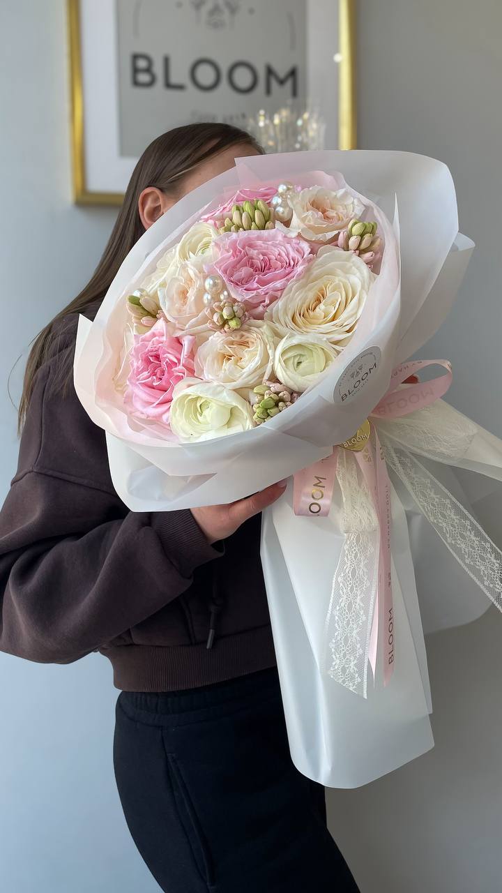 Вишуканий букет у світлих пудрових відтінках, який виглядає як справжній витвір мистецтва. Півонієподібні троянди O’Hara у білому та рожевому кольорі створюють ніжну основу композиції, рожевий гіацинт додає фактурності та легкого весняного аромату, а декоративні перлини підкреслюють витонченість і преміальність букета. Цей букет виглядає дуже делікатно, стильно та дорого — ідеальний вибір для особливих моментів, коли важливо передати глибокі почуття та увагу до деталей.