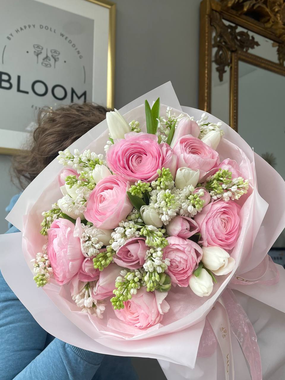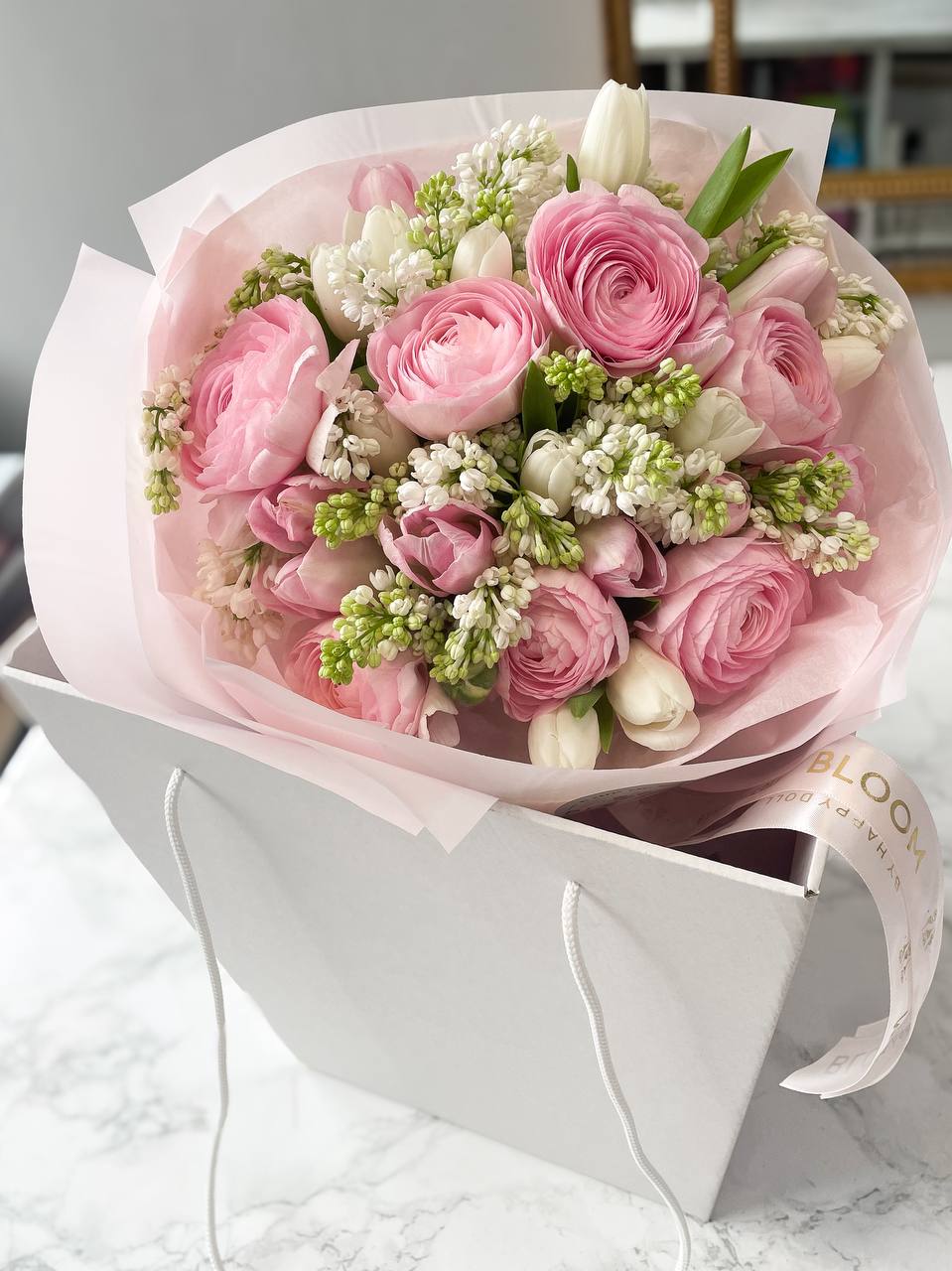 Витончений букет, у якому ніжність звучить у кожній деталі. Повітряні рожеві ранункулюси створюють об’єм і романтичний характер, білі та рожеві тюльпани додають легкості, а маттіола наповнює композицію тонким, приємним ароматом. Цей букет виглядає дуже делікатно та елегантно — ідеальний вибір для зізнань, теплих моментів і подарунків “без приводу”. Він ніби говорить: про тебе думають, тебе цінують і тебе дуже люблять.