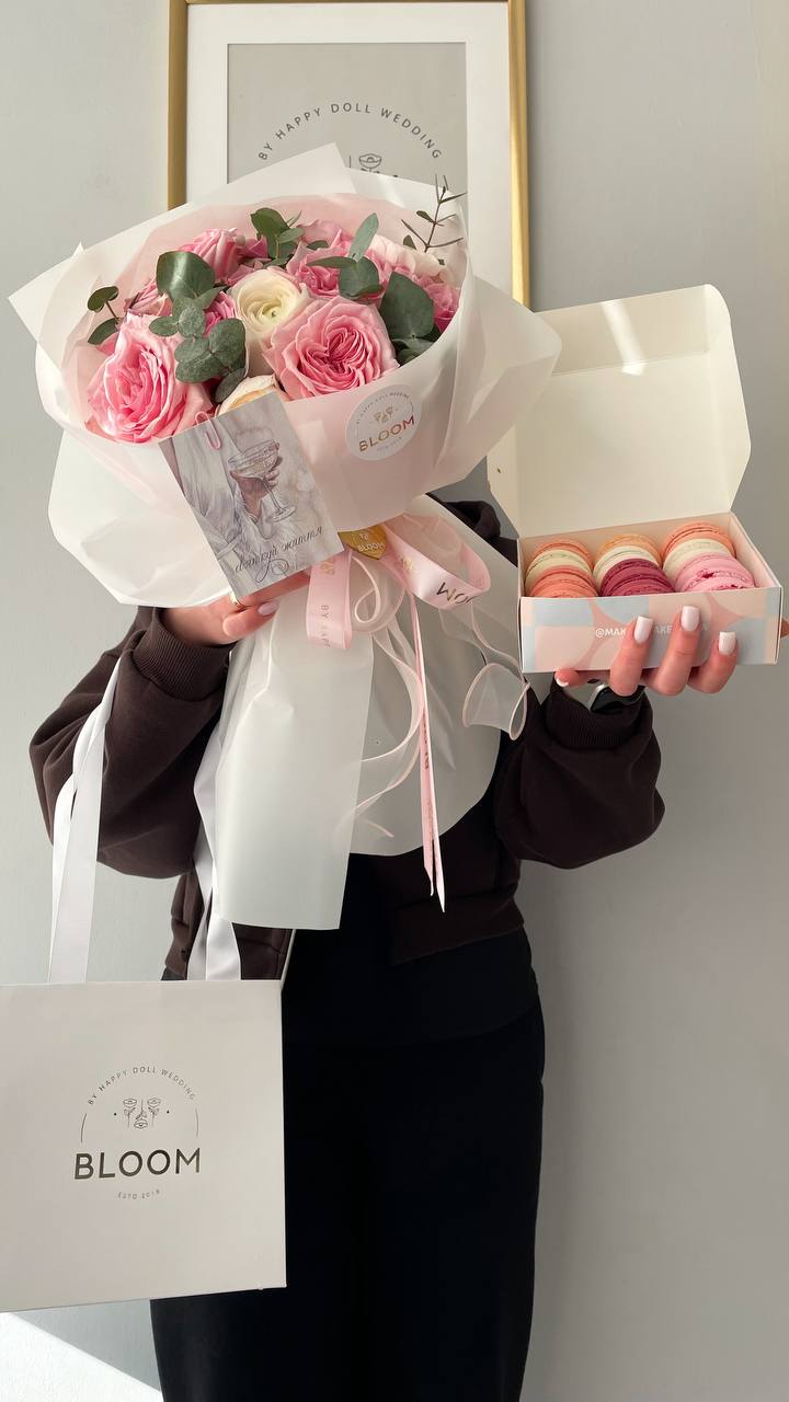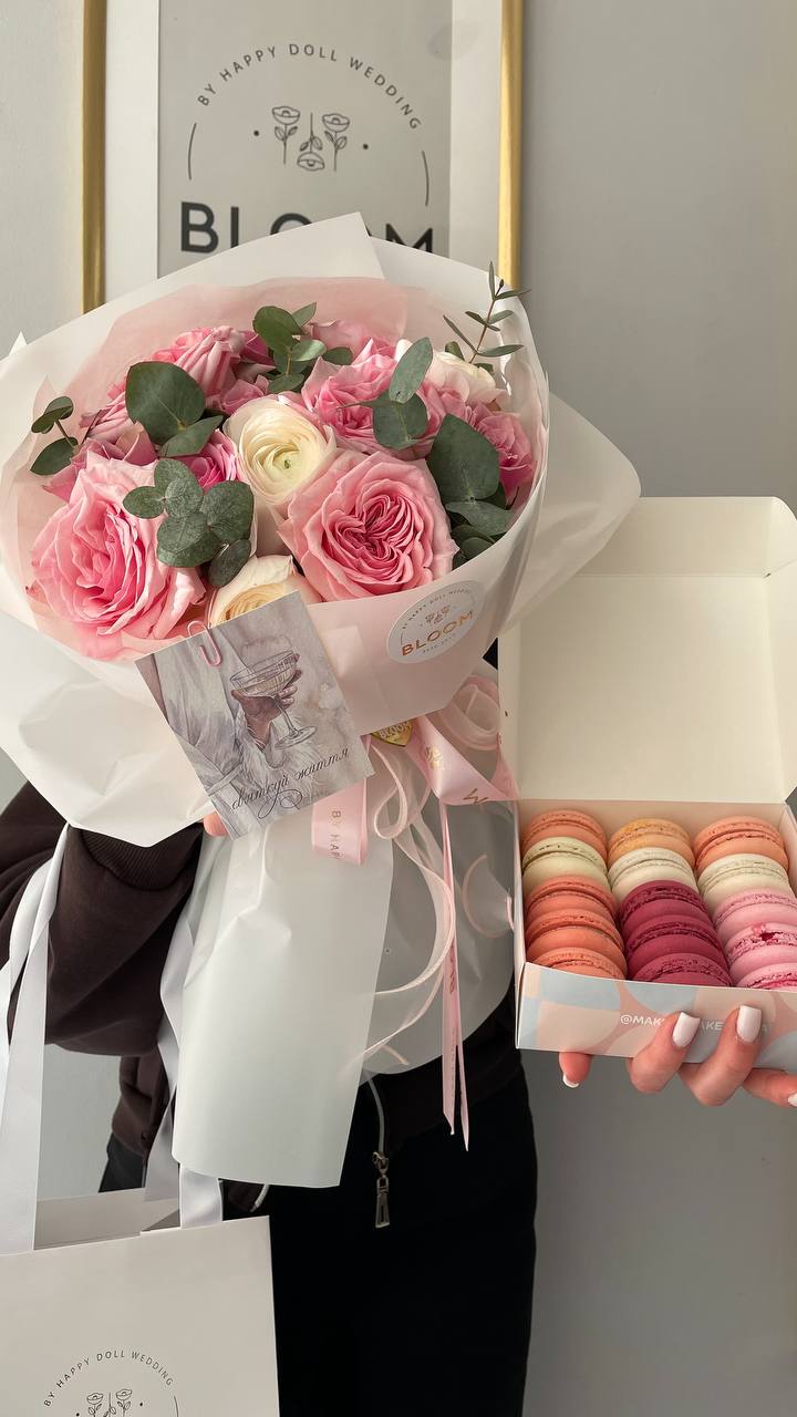 Романтичний букет у ніжних рожево-кремових відтінках, який виглядає так само привабливо, як і відчувається. Рожева троянда O’Hara створює головний акцент — глибокий, пудровий і дуже витончений, білий ранункулюс додає легкості та об’єму, а евкаліпт привносить свіжість і стильний завершений вигляд. Ця композиція ідеально поєднується з коробкою макаронів, створюючи подарунок, який говорить про турботу, ніжність і бажання порадувати по-особливому. Ідеально для романтичного жесту або приємного сюрпризу без приводу.