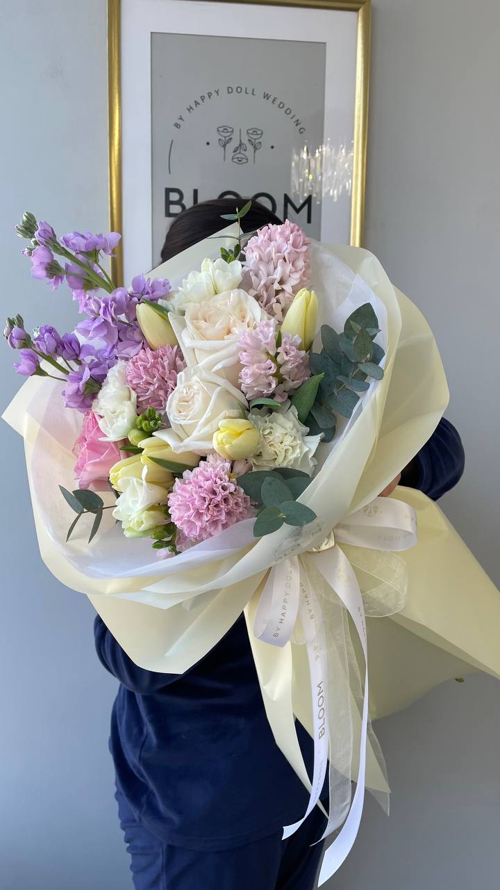 Витончений весняний букет квітів у ніжній пастельній палітрі створює атмосферу легкості, гармонії та романтики. Білі троянди формують елегантну основу композиції, а ніжні гіацинти, тюльпани та декоративні квіткові акценти додають букету природної свіжості та легкого весняного настрою.