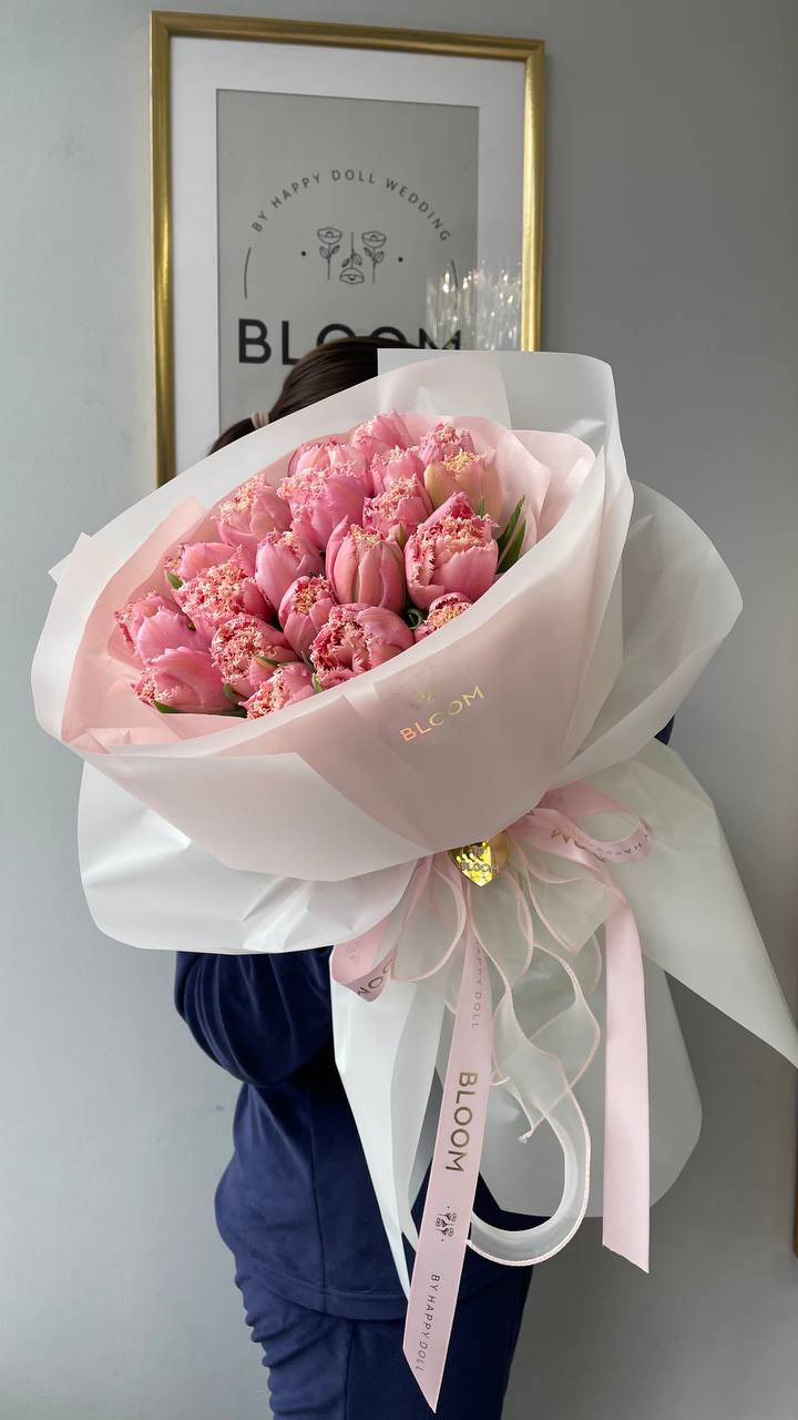 Розкішний букет з півонієподібних рожевих тюльпанів 25 шт виглядає неймовірно ніжно та елегантно. Їхні об’ємні пелюстки створюють ефект легкої хмаринки, наповненої теплом, романтикою та весняним настроєм.