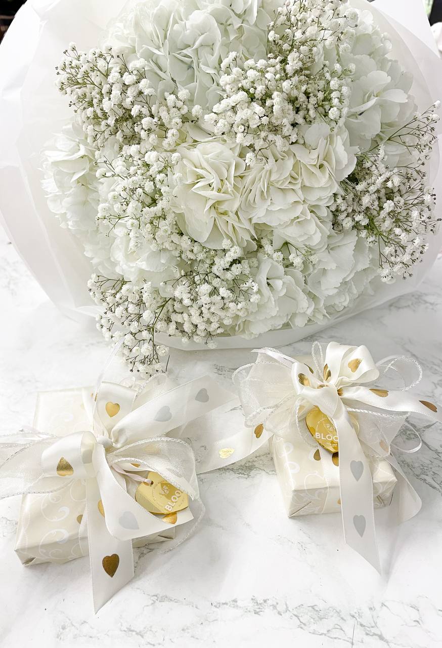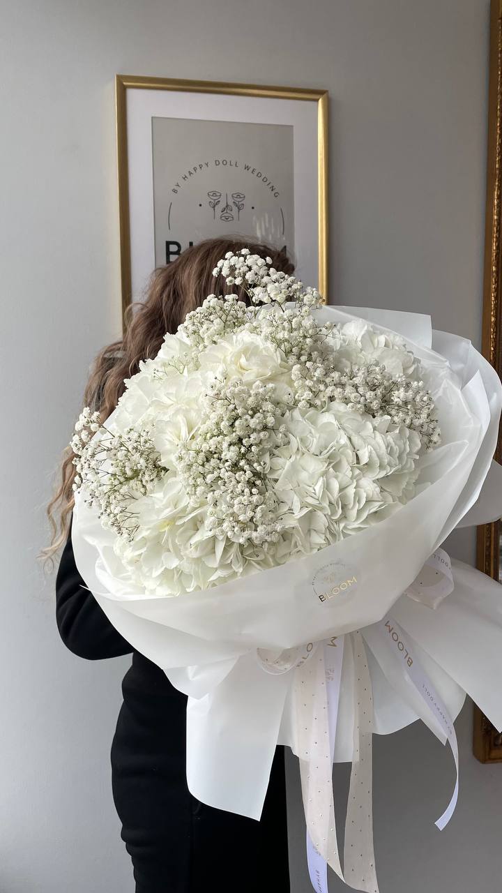 Неймовірно ніжна композиція «Іній та Ніжність» створена у світлих, морозно-чистих відтінках, що нагадують перший зимовий ранок. Білі гортензії, пухнасті хмаринки гіпсофіли та чарівна текстура пелюсток символізують спокій, тепло та святкову атмосферу.