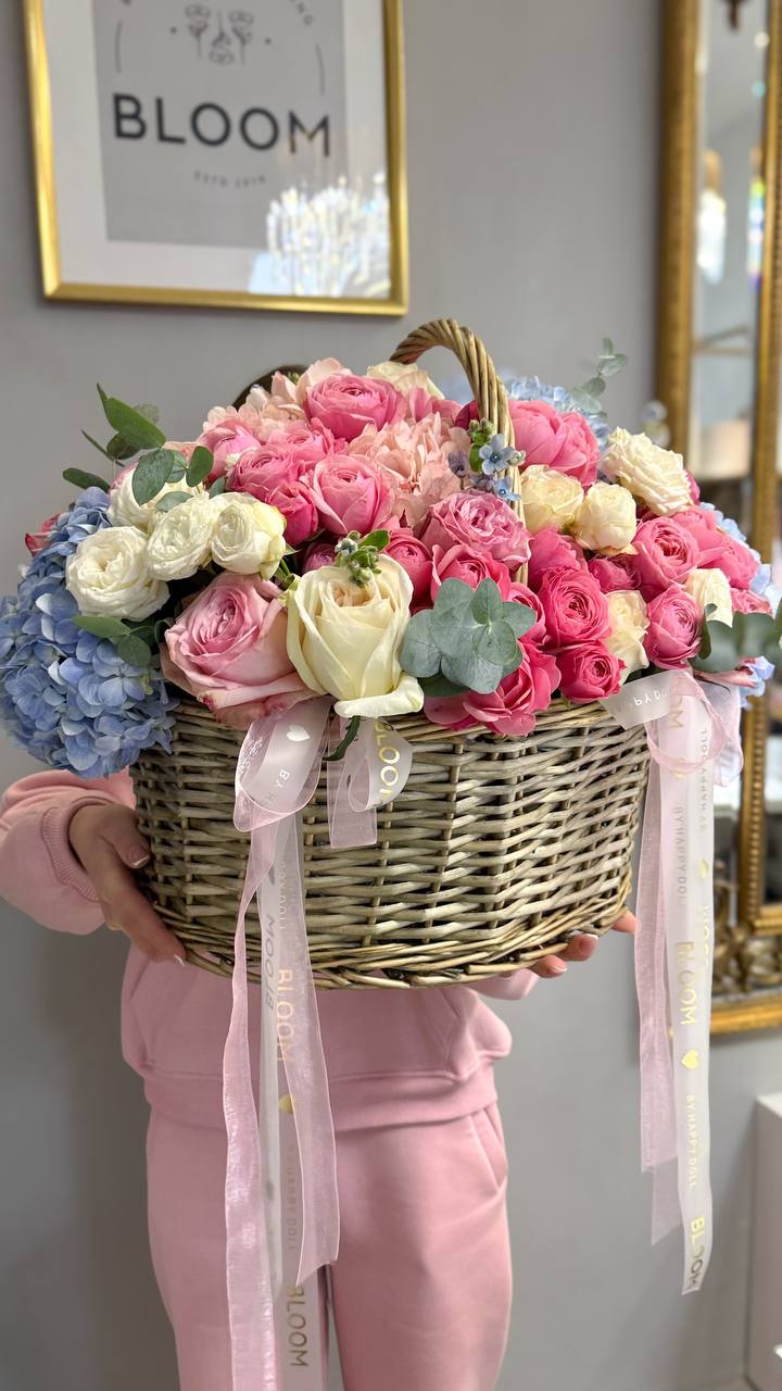 Розкішна квіткова композиція у плетеному кошику — це справжня симфонія ніжності та кольору. Пудрові, рожеві та малінові троянди гармонійно поєднуються з кремовими відтінками, блакитною та рожевої гортензією та легкою зеленню евкаліпта, створюючи об’ємний і живий букет.