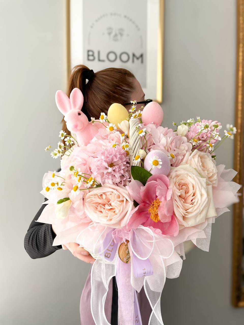 Вишукана великодня композиція у кошику, наповнена світлом, ніжністю та святковим настроєм. Пудрові троянди, повітряна гортензія, ромашки та сезонні квіти створюють легкий і гармонійний образ, доповнений декоративними яйцями та милим зайчиком. Ця композиція виглядає дуже ніжно та емоційно — вона ідеально передає атмосферу весни, тепла та сімейного затишку. Такий подарунок не просто прикрашає простір, а створює настрій.