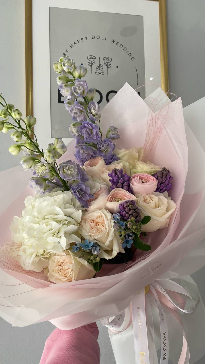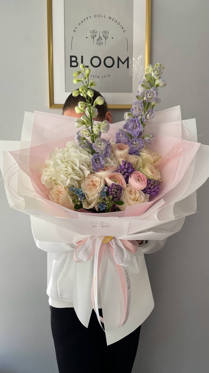 Вишуканий букет у ніжних пастельних відтінках, де кожна деталь продумана до дрібниць. Повітряна біла гортензія створює об’єм і легкість, кремові троянди додають елегантності, а вертикальні акценти дельфініуму у лавандових тонах надають композиції витонченості та характеру.