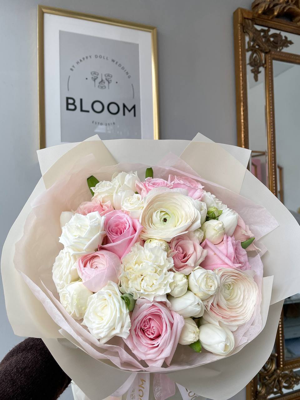 Композиція поєднує ранункулюси, троянди, еустому та легкі акценти бутонів, формуючи м’який, повітряний об’єм. Квіти зібрані у гармонійну округлу форму та оформлені в напівпрозоре фірмове пакування Bloom, що підкреслює їхню природну красу.