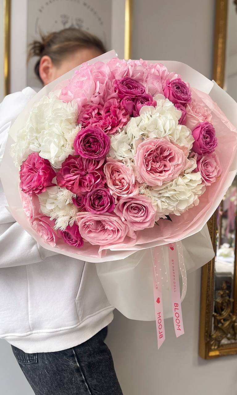 У композиції поєднані садові троянди та повітряні гортензії, які створюють глибину фактур і м’який, романтичний характер. Напівпрозоре фірмове пакування Bloom підкреслює форму букета, а стрічки з логотипом додають завершеного, преміального вигляду.
