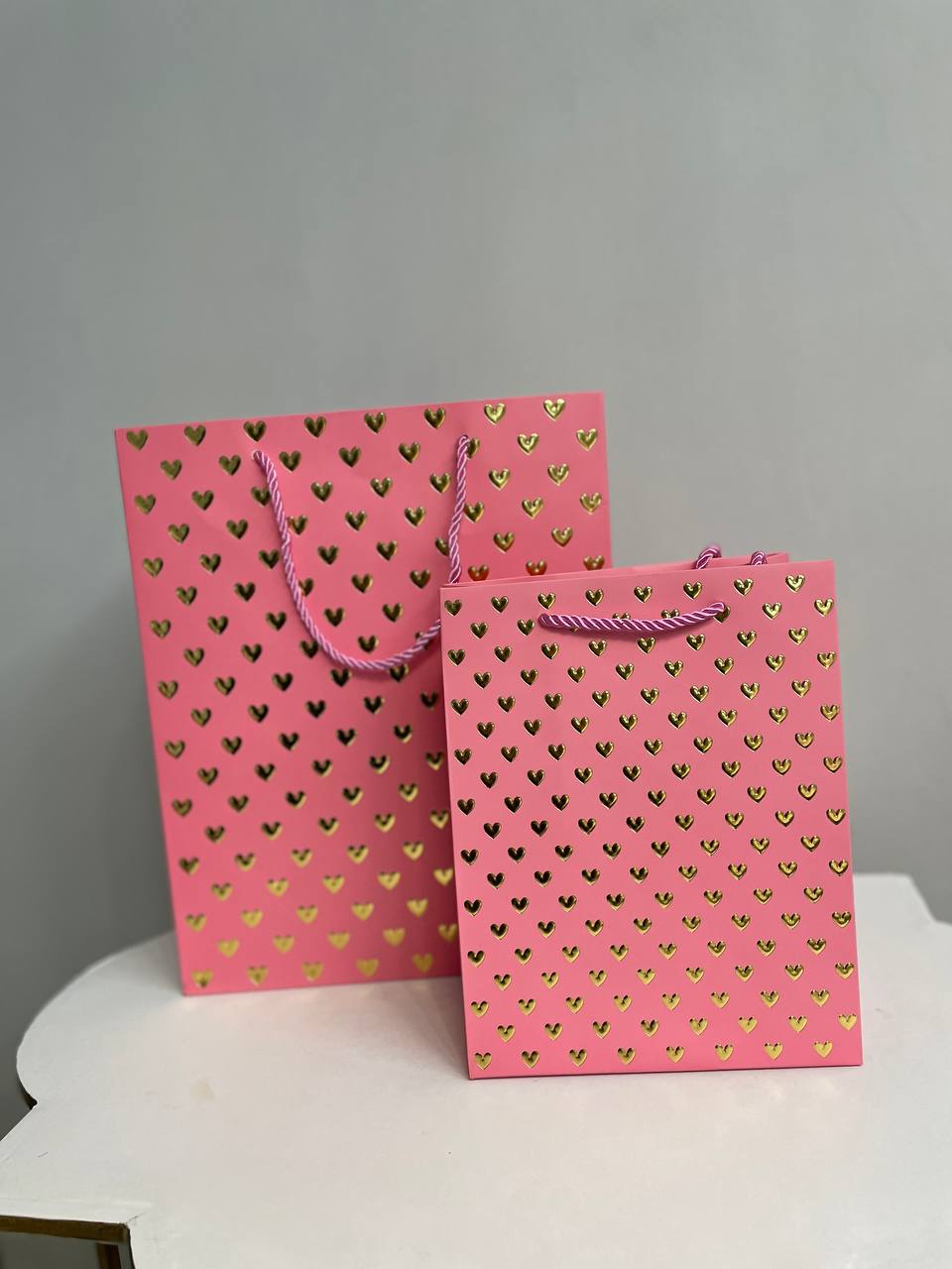 Паперовий подарунковий пакет «Pink Gold Hearts» — ніжне та стильне пакування у рожевому відтінку з глянцевим золотим тисненням у формі сердечок. Поєднання м’якого рожевого кольору та теплого золота створює романтичний настрій і робить подарунок ще більш зворушливим.