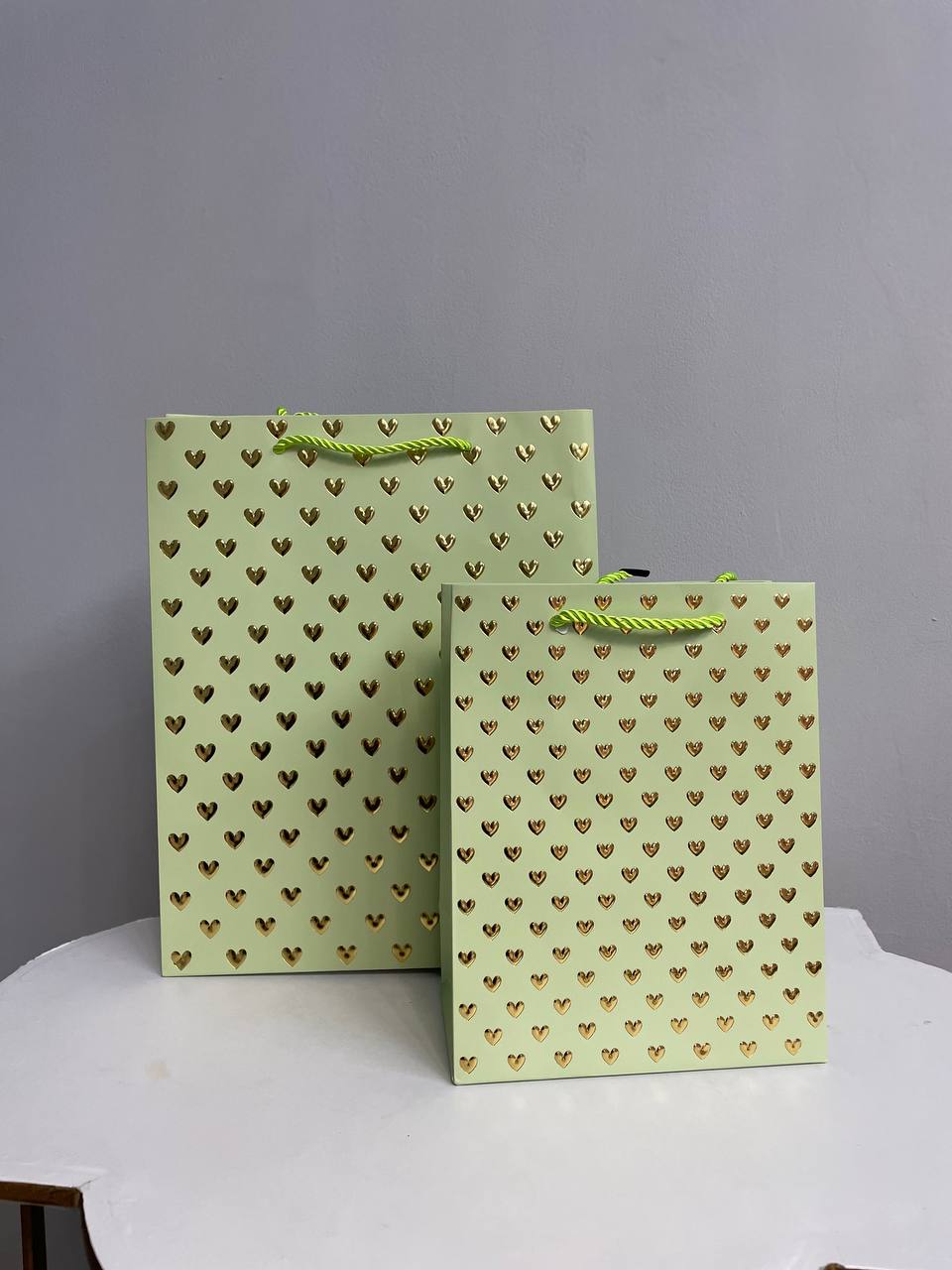 Паперовий подарунковий пакет «Pistachio Gold Hearts» — стильне та ніжне пакування у трендовому фісташковому відтінку з глянцевим золотим тисненням у формі сердечок. Світло-зелений колір виглядає свіжо та легко, а золото додає святковості й преміального акценту.