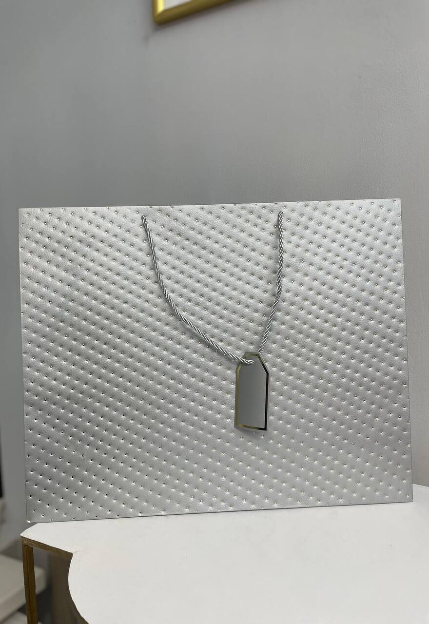 Щільний папір добре тримає форму, а сріблясті кручені ручки гармонійно доповнюють загальний образ. Мінімалістична бірка додає завершеності та дозволяє персоналізувати подарунок.