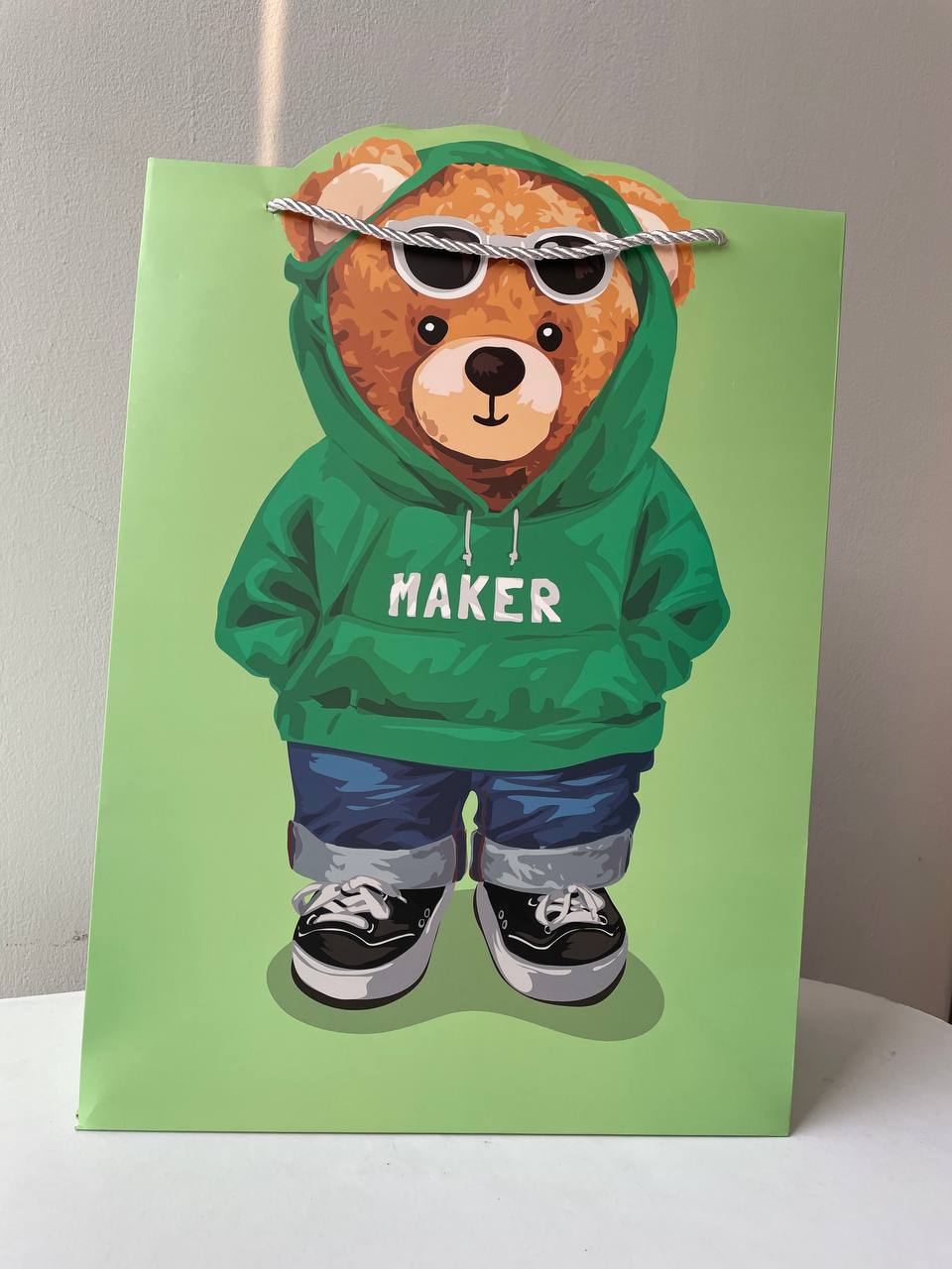 Паперовий подарунковий пакет «Ведмедик Maker» (30x40x12) — стильне та сучасне пакування для дитячих і підліткових подарунків. Дизайн із ведмедиком у зеленому худі та кедах створює трендовий street-style настрій і чудово підходить як для хлопчиків, так і для дівчаток.
