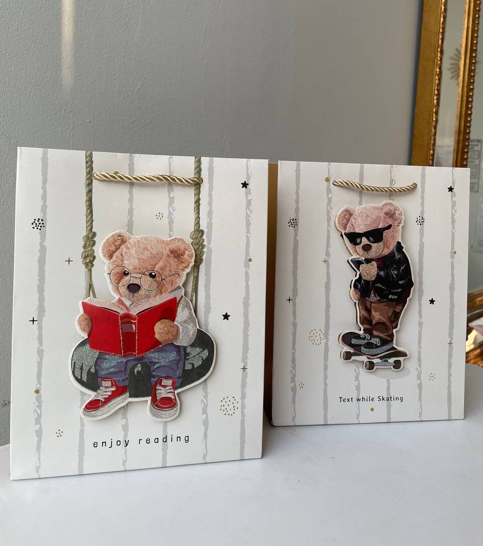 Паперовий подарунковий пакет «Ведмедик з книгою» — стильне та затишне пакування для розумних і теплих подарунків. Дизайн із милим ведмедиком, що читає книгу, створює атмосферу спокою, розвитку та турботи.