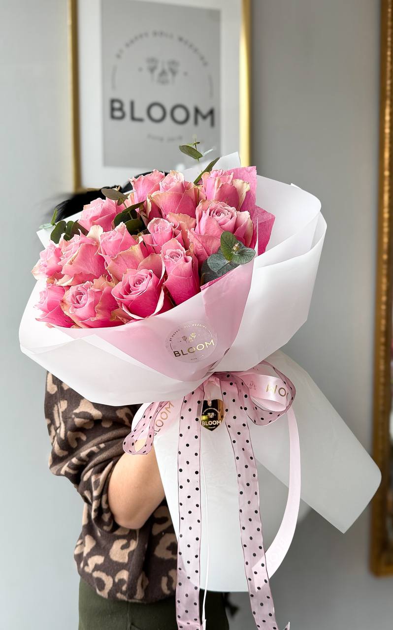 Букет оформлений у фірмовий напівпрозорий папір Bloom та доповнений ніжною рожевою стрічкою у горошок 🎀 — стильний акцент, що підкреслює романтичний характер композиції.