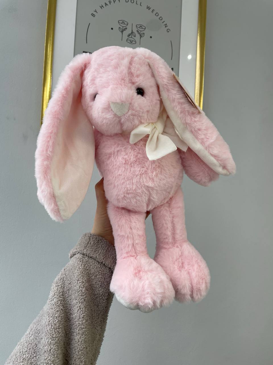 Зайчик виготовлений з дуже м’якого плюшу приємного рожевого відтінку, має довгі вушка та акуратний світлий бантик, що додає образу особливої легкості та чарівності.
