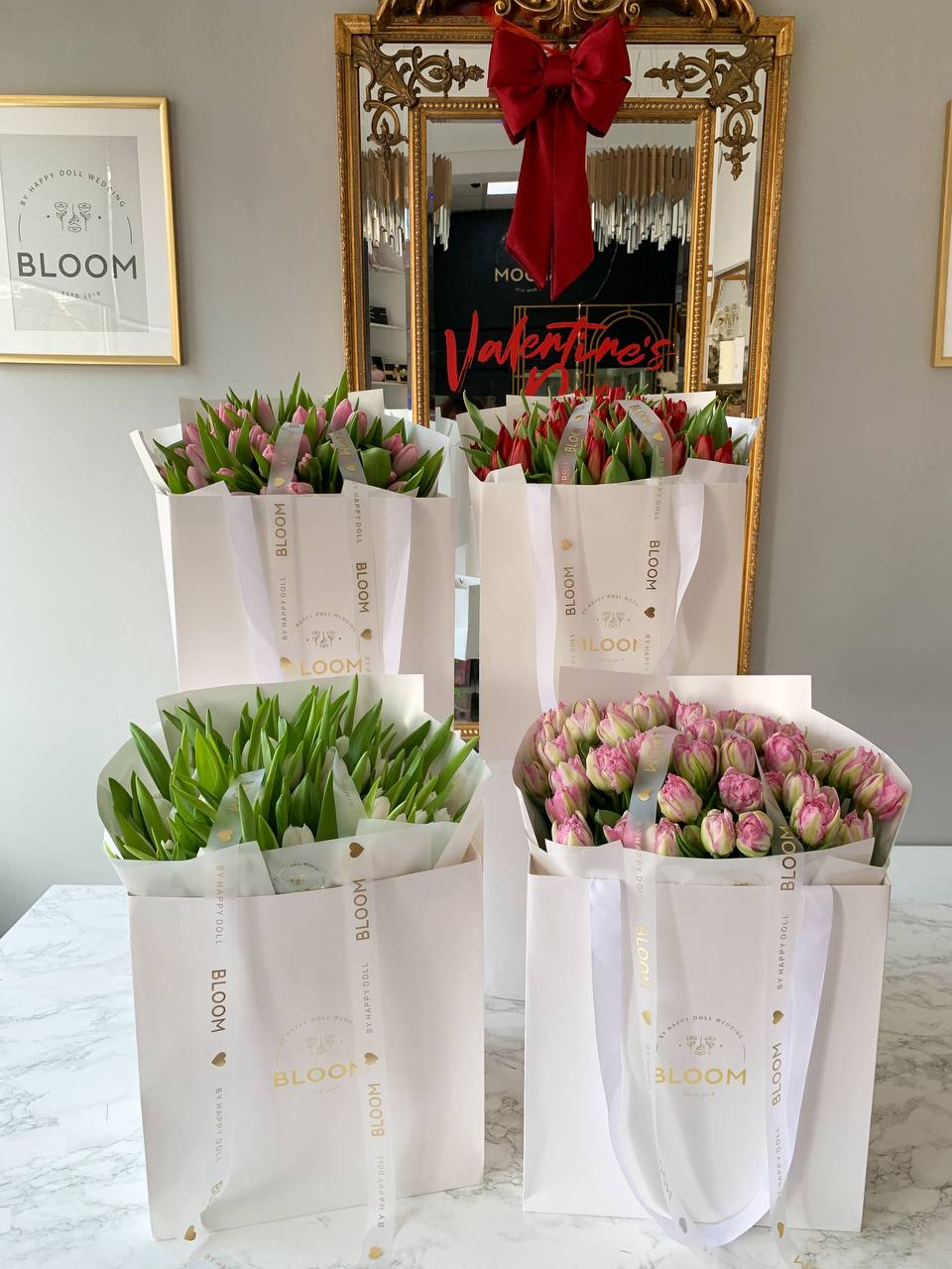Щільні, свіжі бутони з насиченою зеленою листвою зібрані у фірмове напівпрозоре пакування Bloom та доповнені ніжними стрічками з золотистими акцентами.