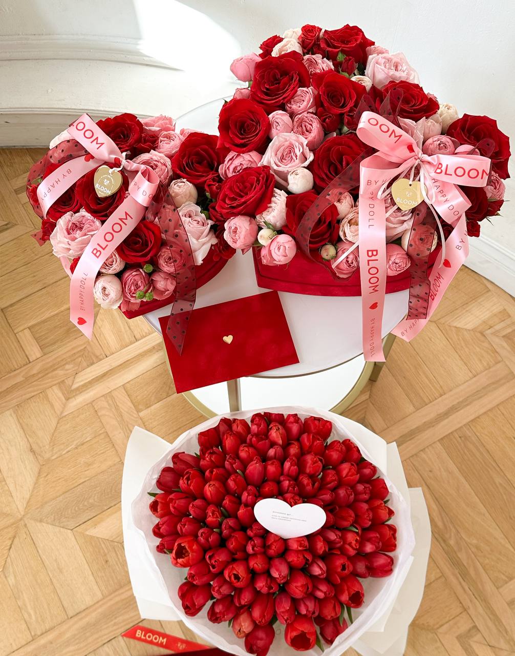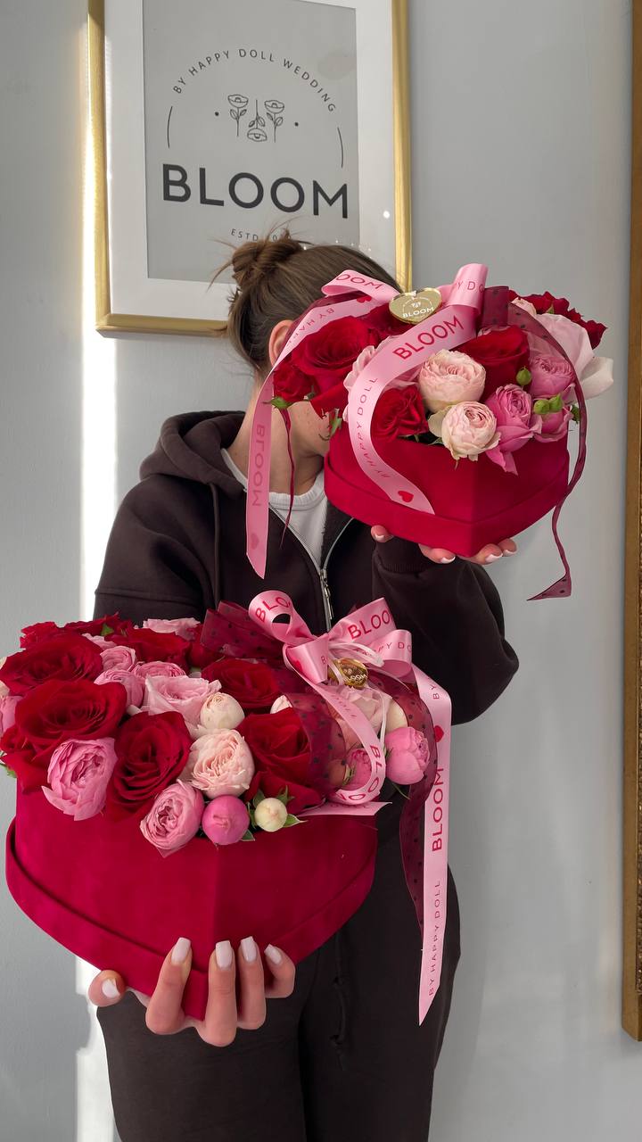 Романтичні квіткові серця від Bloom — це готове зізнання у почуттях. Насичені червоні троянди, ніжні рожеві відтінки та витончена фірмова стрічка створюють розкішну композицію, яка зачаровує з першого погляду.
