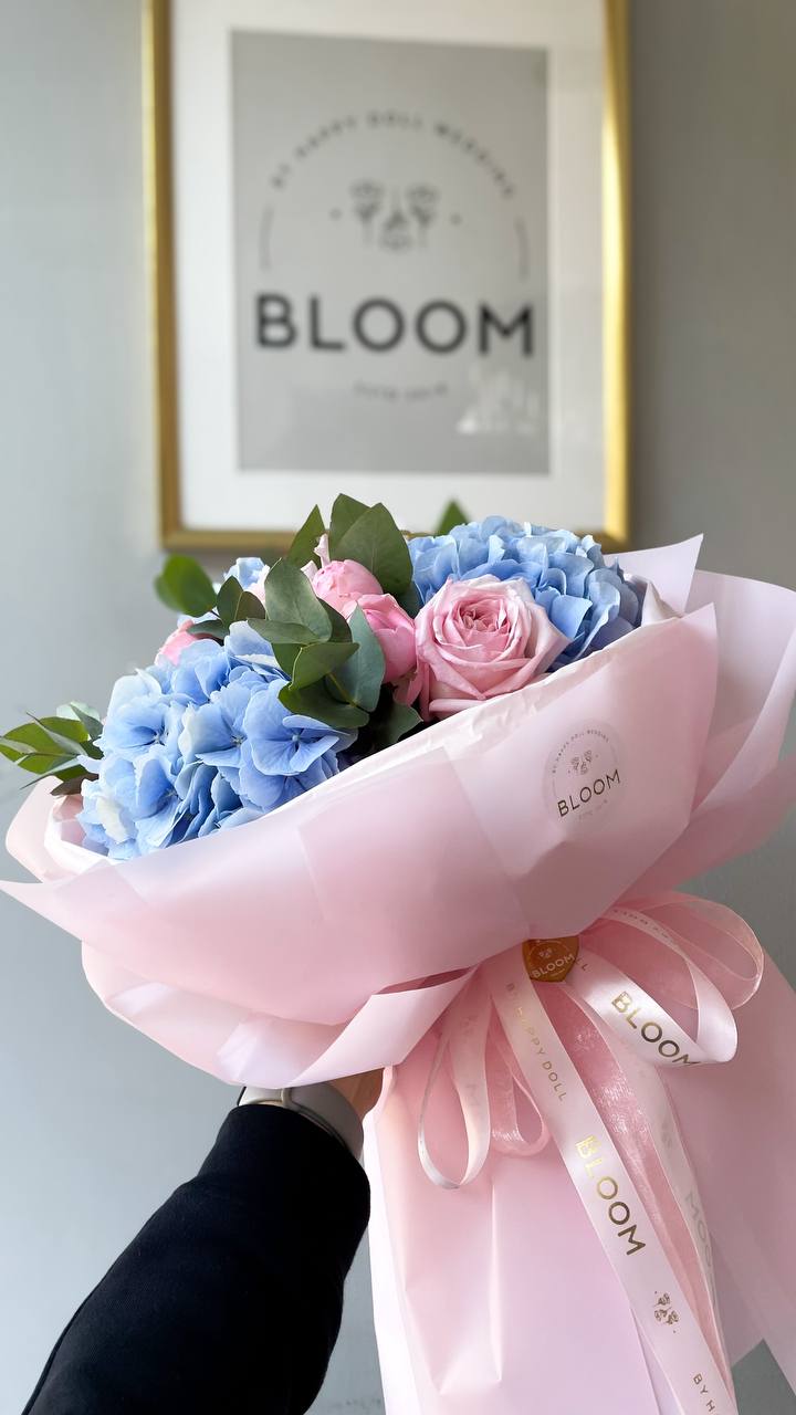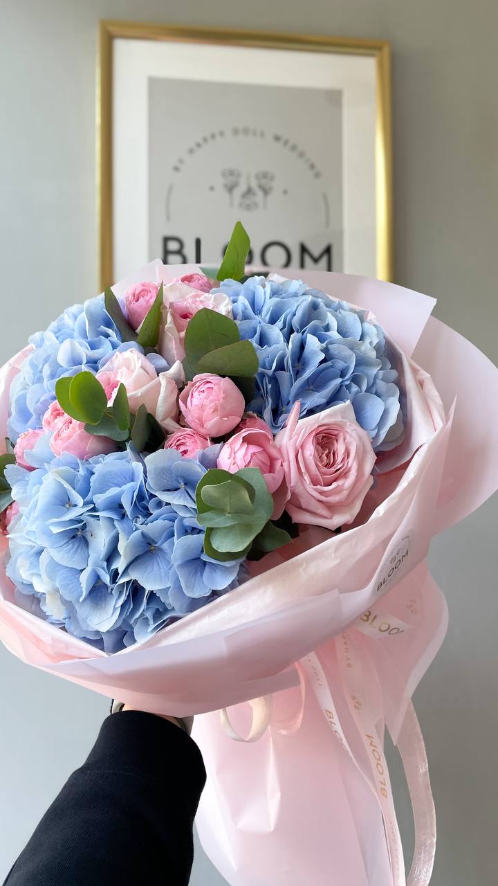 Поєднання небесно-блакитної гортензії та рожевих троянд створює відчуття спокою, ніжності й любові. Цей букет — про чисті почуття, легкість і гармонію. Наче ранкове небо, яке зустрічає перші промені сонця — теплі, як дотик коханої людини 💫