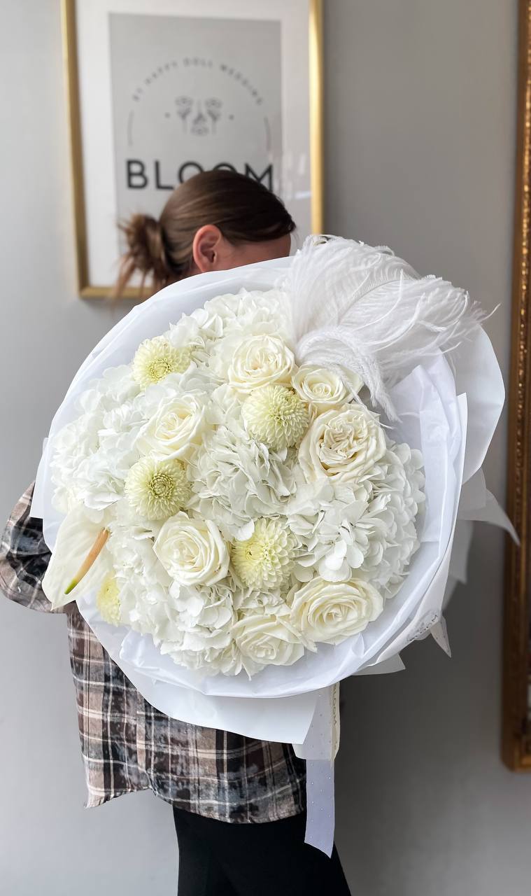 Букет оформлено у монохромній палітрі з м’якими молочними та кремовими нюансами. Легкі пір’їнки додають йому ще більшої повітряності, роблячи композицію особливою, святковою та дуже естетичною.
