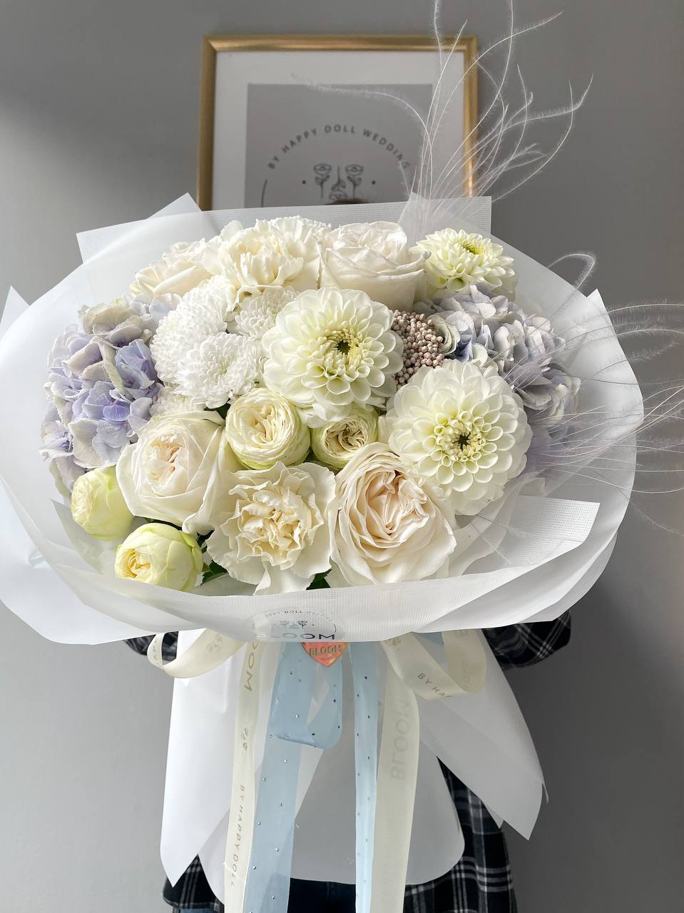 Витончений букет у біло-кремових тонах із легким лавандовим відтінком — гармонійне поєднання троянд, жоржин і гортензії. Він дихає спокоєм, ніжністю та світлом, передаючи найщиріші почуття без слів. Ідеальний подарунок для особливих моментів, коли хочеться сказати просто: «Я тебе люблю».