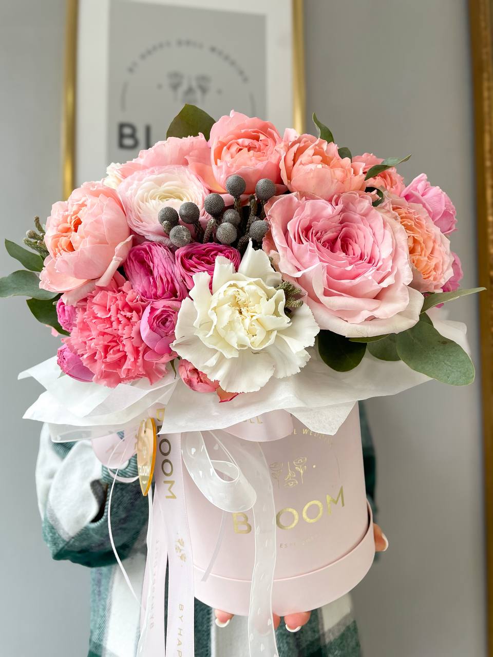 У ніжно-рожевому боксі Bloom by Happy Doll зібрані півонієподібні троянди, яскраві ранункулюси, ароматні гвоздики та акценти з декоративних ягід — усе в теплій, гармонійній пастельно-рожевій палітрі.