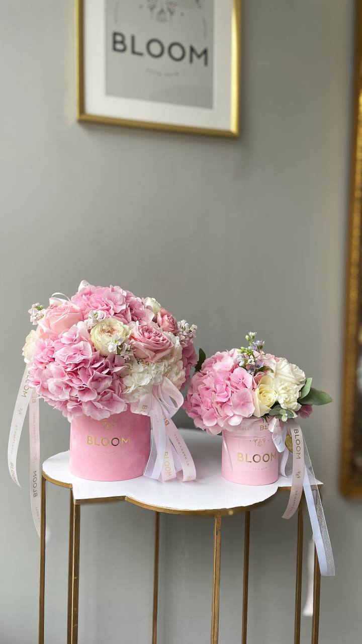 Ці квіткові композиції у фірмових оксамитових боксах Bloom by Happy Doll — справжня елегантність у рожевих відтінках. Об’ємні повітряні гортензії, кремово-рожеві троянди та ніжні акценти дрібних квітів створюють ефект м’якої, витонченої хмаринки, яка наповнює простір теплом та красою.