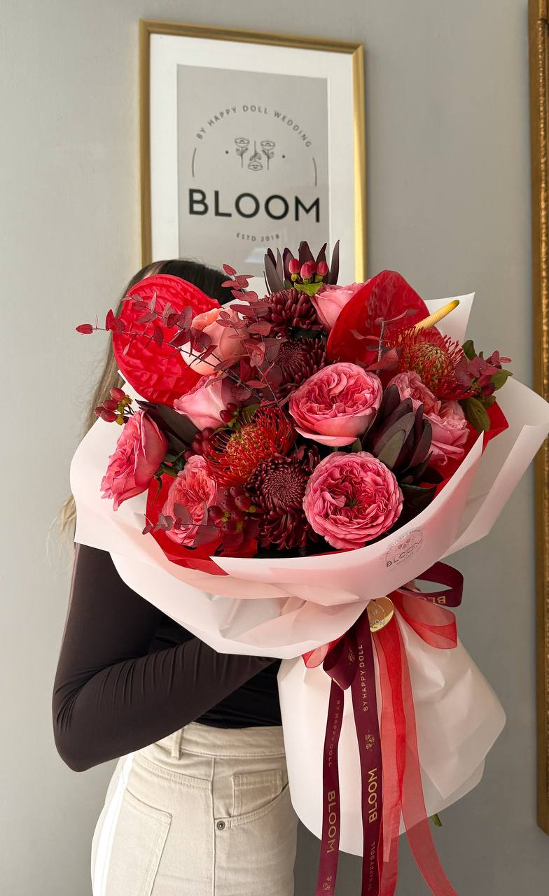 Цей букет — справжня історія пристрасті, сили та елегантності, зібрана в одному яскравому акценті. Глибокі бордові відтінки переплітаються з насиченим рожевим, створюючи драматичний та ефектний образ, який неможливо забути.