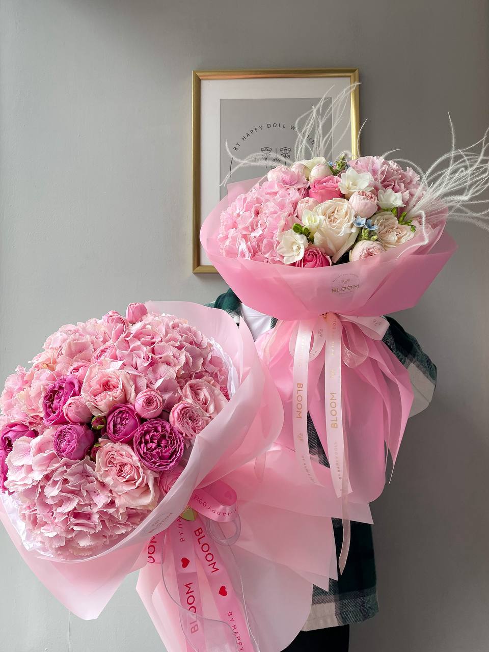 Ніжність у кожній пелюстці, розкіш у кожному відтінку рожевого. Два букети — дві історії про любов, що говорить мовою квітів. Поєднання півоній, троянд і гортензії створює настрій тепла, мрій і щирих почуттів. Ці букети — як обійми, у які хочеться повертатись знову й знову 🌸