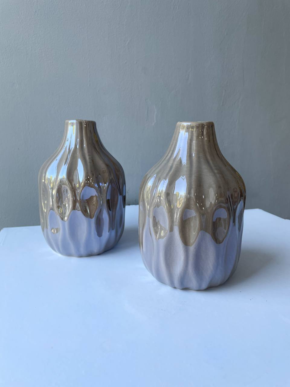 Елегантні керамічні вази в теплих бежевих тонах з глянцевою хвилястою фактурою. Переливчаста поверхня створює м’яку гру світла, роблячи ці вази стильним акцентом у будь-якому інтер’єрі. Вони чудово підходять для міні-букетів, сухоцвітів та декоративних гілочок, додаючи простору затишку й вишуканості.