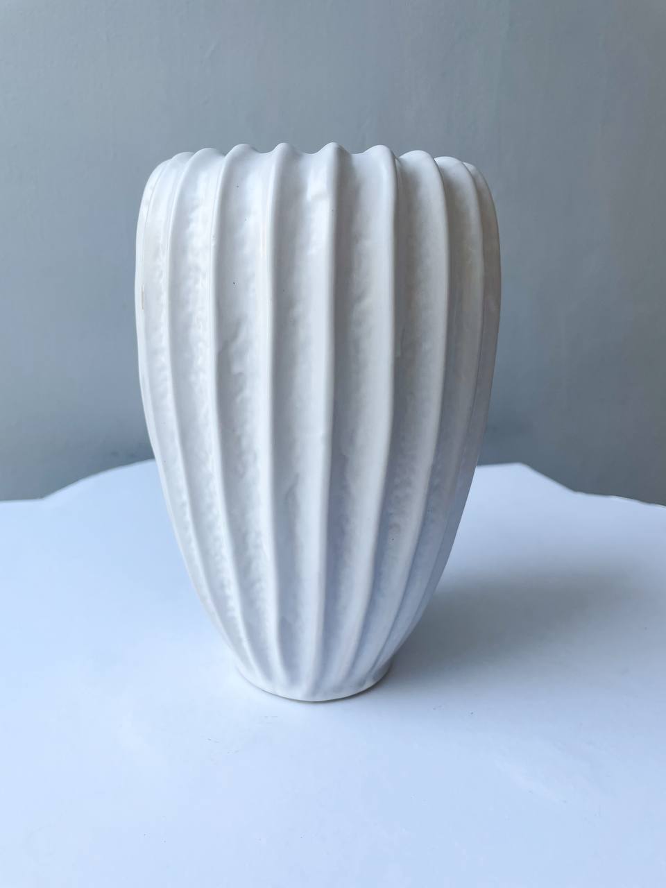 Стильна керамічна ваза в білому матовому відтінку з вертикальною рифленою фактурою. Лаконічна форма та м’які лінії надають їй сучасного, елегантного вигляду. Ідеальна для авторських букетів та стриманих інтер’єрних композицій, додаючи простору світла та гармонії.